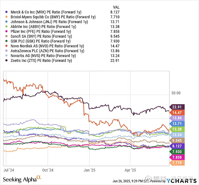 而强生(JNJ,13.71)、艾伯维(ABBV,13.38)、阿斯利康(AZN,13.86)、诺华(NVS,13.24)和诺和诺德(NVO,14.47)等药企估值介于10-15倍市盈率区间,显示市场给予其相对稳定的增长预期。