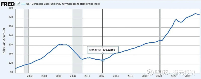 2007-2008年的“次贷危机”五年后,2012年初,美国房价逐步见底,图示为美国房价指数(S&P CoreLogic Case-Shiller 20-City Composite Home Price Index),从2012年3月最低点136.62到2025年2月最高点340.12,13年涨了2.5倍……