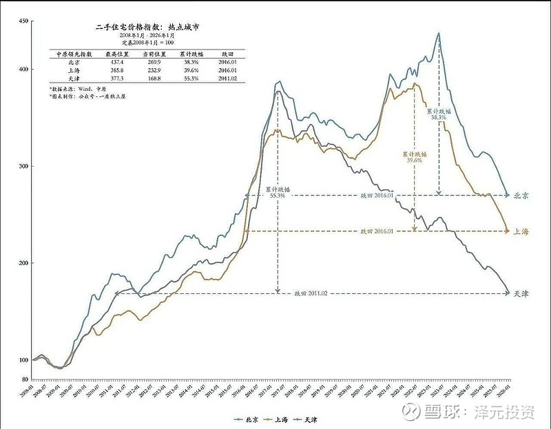 截至2026年1月,北京房价已从最高点下跌38.3%、上海房价已从最高点下跌39.6%、天津房价已从最高点下跌55.3%(跌至十五年前的价格水平)。