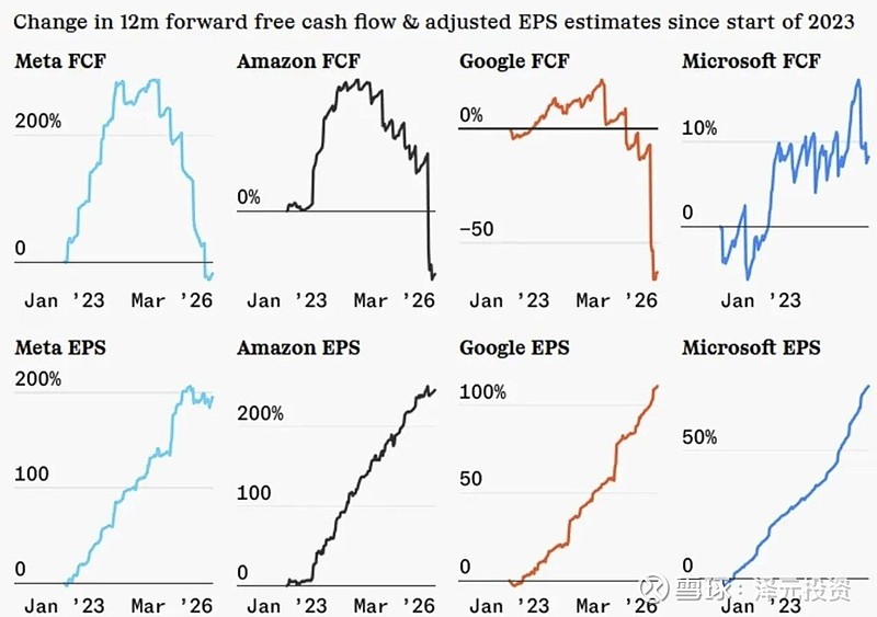 泽元在今年3月6日的帖子中已经指出:美国科技巨头们需要消耗大量的自由现金流建设硬资产(数据中心和发电设施),直接推高企业的资本开支规模,并使得科技巨头的自由现金流大幅下降。