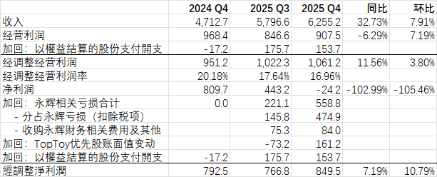 Q4收入同比大涨,经调整经营利润率增速11.56%,高于全年增速7.91%。主要亮点是:“根據對2026年首兩個月銷售數據的初步審閱,本公司持續展現正面的業務勢頭。於中內地市場,名創優品品牌的GMV同比增長超過25%,同店GMV錄得至少高單位數同比增長。於北美市場,名創優品品牌在美國的GMV同比增長超過50%,同店GMV同比增長至少20%。”。
