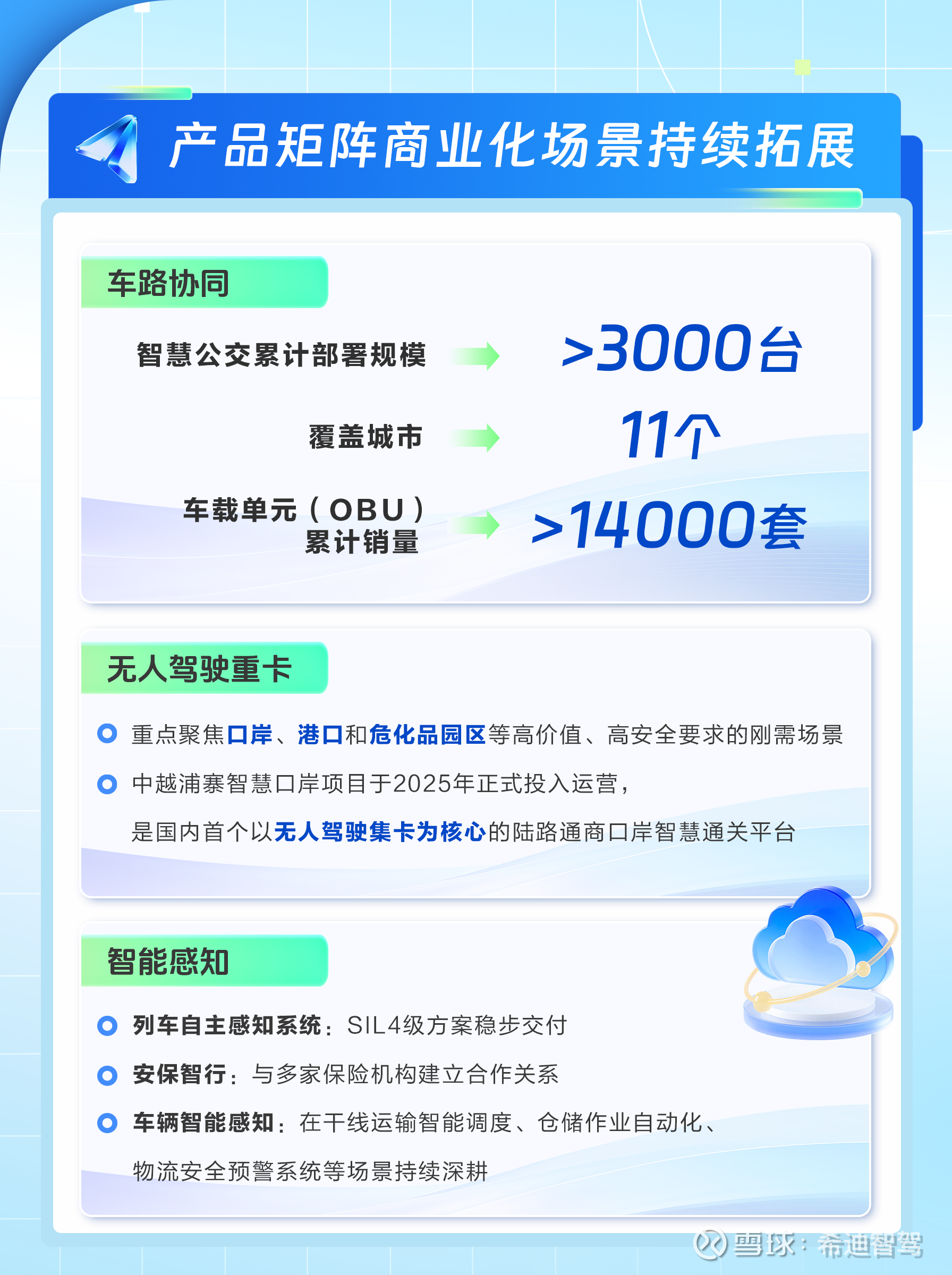 商业化场景全面拓展。截至2025年末,智慧公交累计部署超3000台、覆盖11城,车载单元(OBU)累计销量破14000套;无人驾驶重卡落地中越浦寨智慧口岸;智能感知业务在多个场景持续深耕。