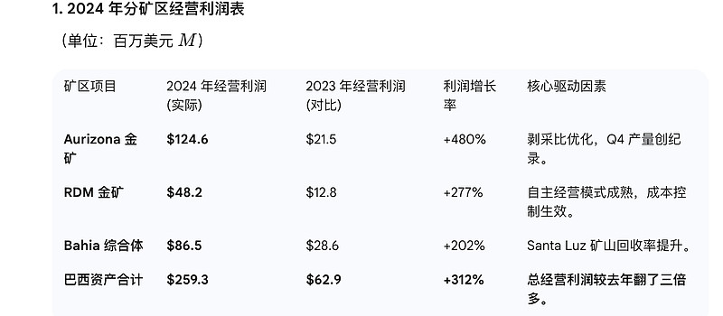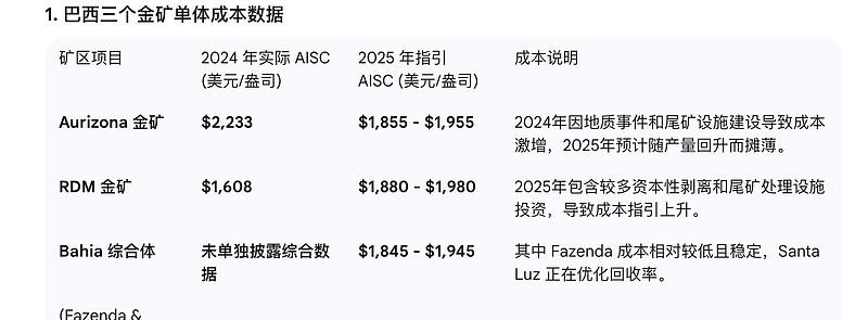 指标Aurizona、RDM 及 Bahia 综合矿区资产性质在产矿山(可立即贡献现金流)黄金储量387.3 万盎司(约 120 吨)黄金资源量501.3 万盎司(约 156 吨)矿石平均品位储量品位:1.45 g/t;资源量品位:1.88 g/t产能/产量