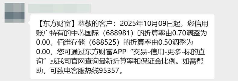 【#中芯国际两融折算率调整为0#】10月9日,有投资者反馈,接东方财富证券短信告知,自当日起,信用账户持有的中芯国际的两融折算率由0.7调整为0.00,佰维存储的两融折算率由0.5调整为0.00。