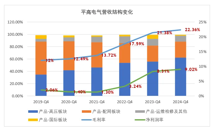 公司主营业务收入构成包括四部分,分别是高压、配网、 国际业务和运维检修及其他。在过去的几年里,公司的运维和国际板块变化不大,主要是高压板块的营收占比在不断提升,配网板块的营收占比不断下降。