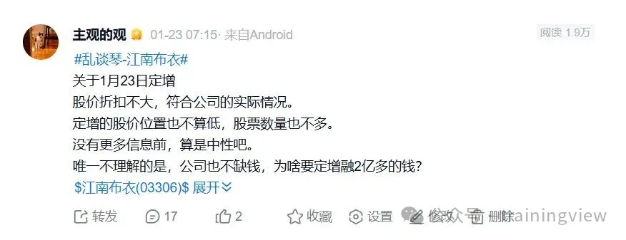 江南布衣在1月23日(上周五)盘前发布公告,以18.78港元,定向增发(即港股的配股)2.8%的股份。