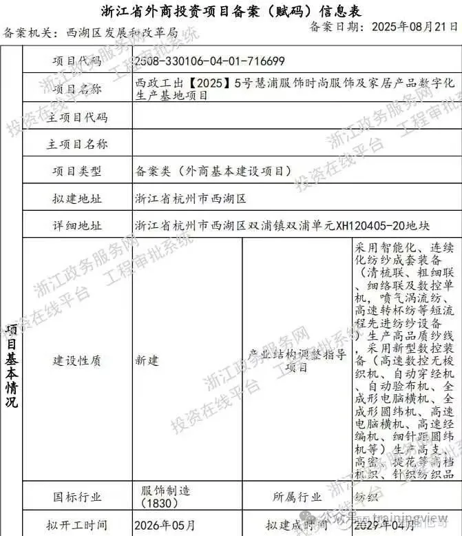根据网络上进一步搜集到的信息,公司计划在杭州建设“时尚服饰及家居产品数字化生产基地项目”,如下图: