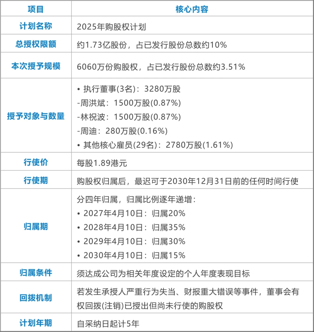 首先,2025年购股权计划将作为公司长效激励机制的基础。该计划授权限额约为1.73亿股,占已发行股份的10%,其中首次授予6060万份购股权,占计划固定限额的100%。
