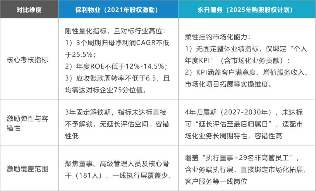 对比两者股权激励方案及业务基本面,永升服务凭借更贴合市场化逻辑的激励设计、更彻底的业务转型布局,靠市场化搏杀达成业绩目标的可能性显著更高。