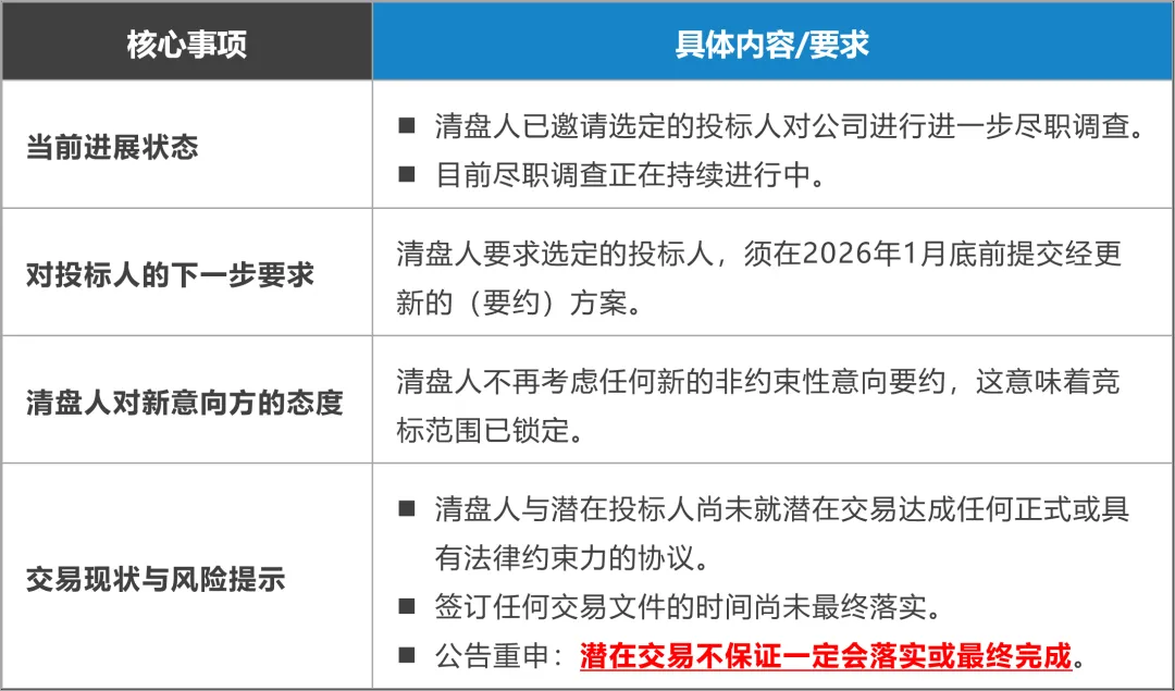 也反映出清盘人对现有投标人池的质量和诚意已有初步判断,旨在提升后续谈判效率,推动交易进入收官阶段。