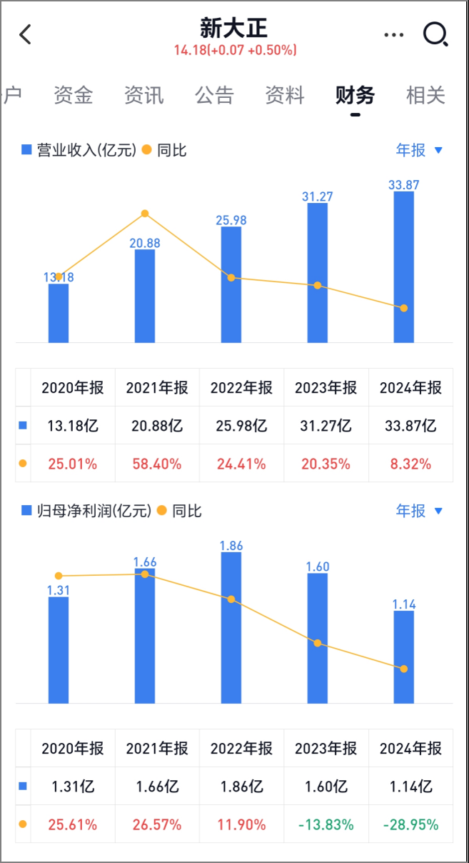 上市以来,新大正的业绩增长曲线逐渐放缓,甚至陷入盈利下滑困境。
