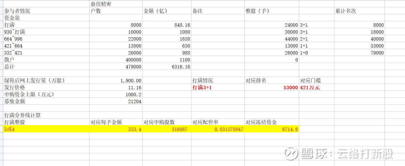 鼎佳精密最终碎股门槛为421万元,冻结资金为6300亿左右(位于预测最高值+100亿)。