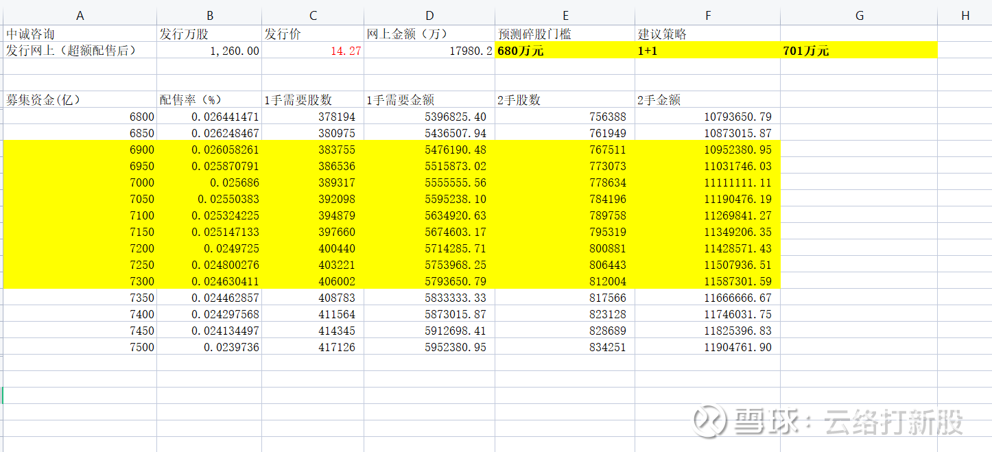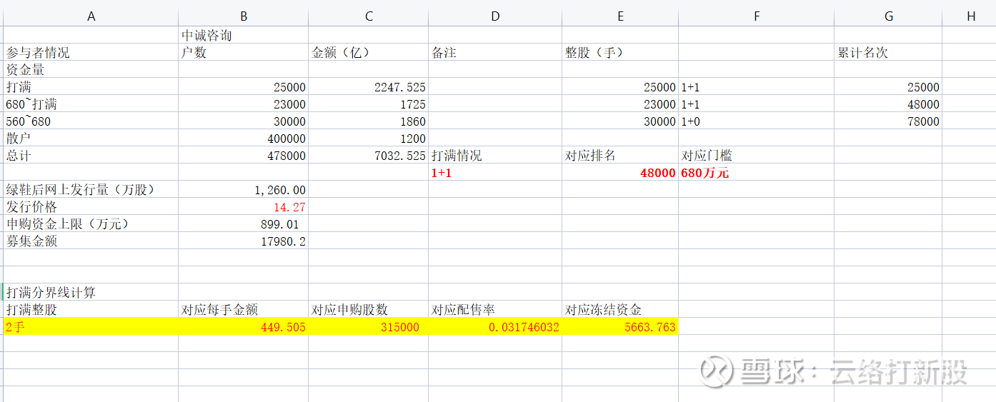 那么本轮中诚咨询预测就很清晰了。中诚发行1260万股,先预测资金,我给了7100亿元正负200亿元,(这个还需要看明晚的数据),看看这一轮陪跑金额,整股应该是会低于580万元的,丹娜所有配售者都是1+1,如果碎股还是600万元,那么就需要1440万股,所以碎股一定会远高于600万元。但是再往上多少,因为没有具体的数据支撑,只能用之前无数轮次的回测。