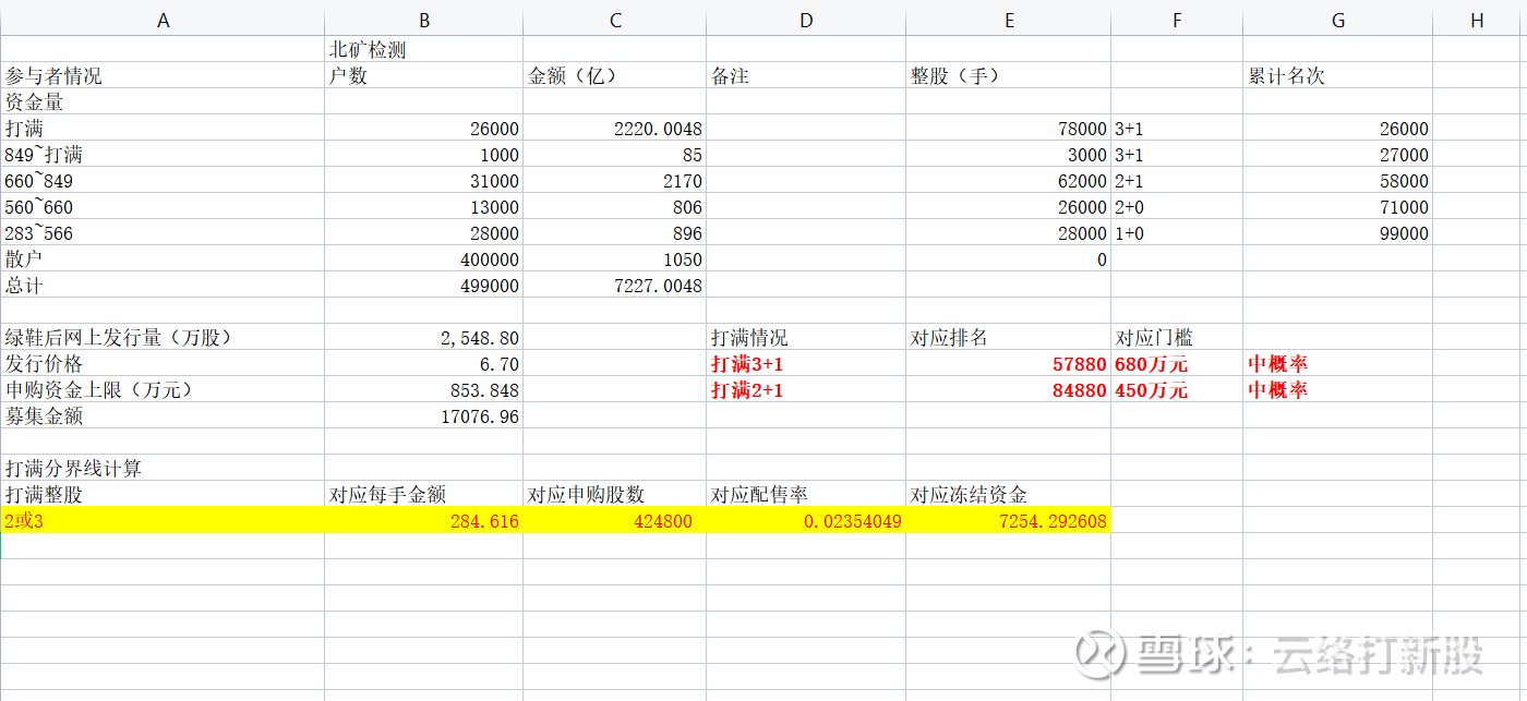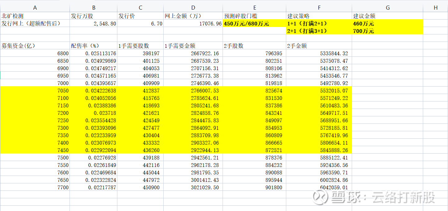 这次预测简单又困难,简单的在于我们有了大量资金分段的户数,困难的是本次资金刚好落在打满分界线处。本次打满分界线为7254亿,而我认为本次资金应该就是7250亿为中值,正负200亿元。因此碎股需要各位判断了。因此本轮我的打新建议,不再是高中低三档,而是各个目标对应的金额。