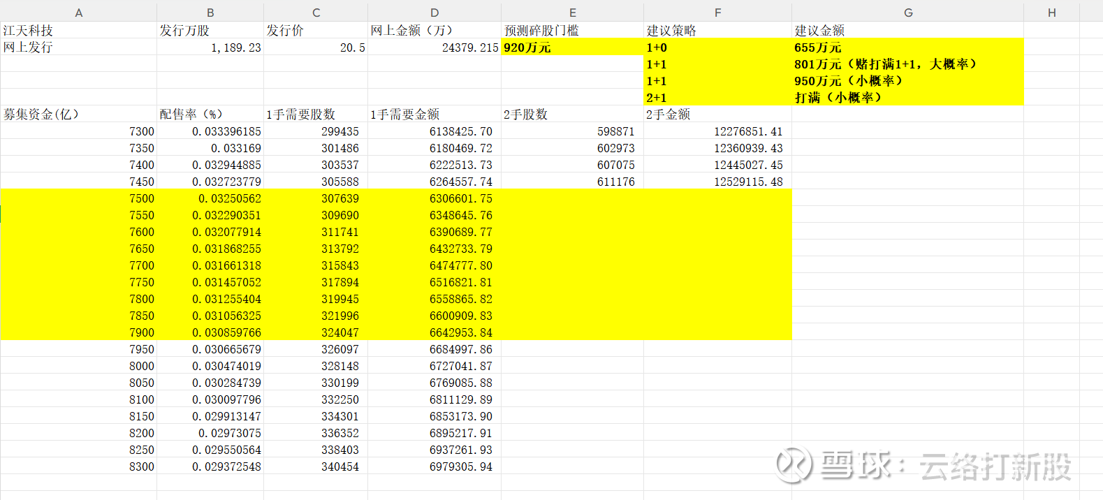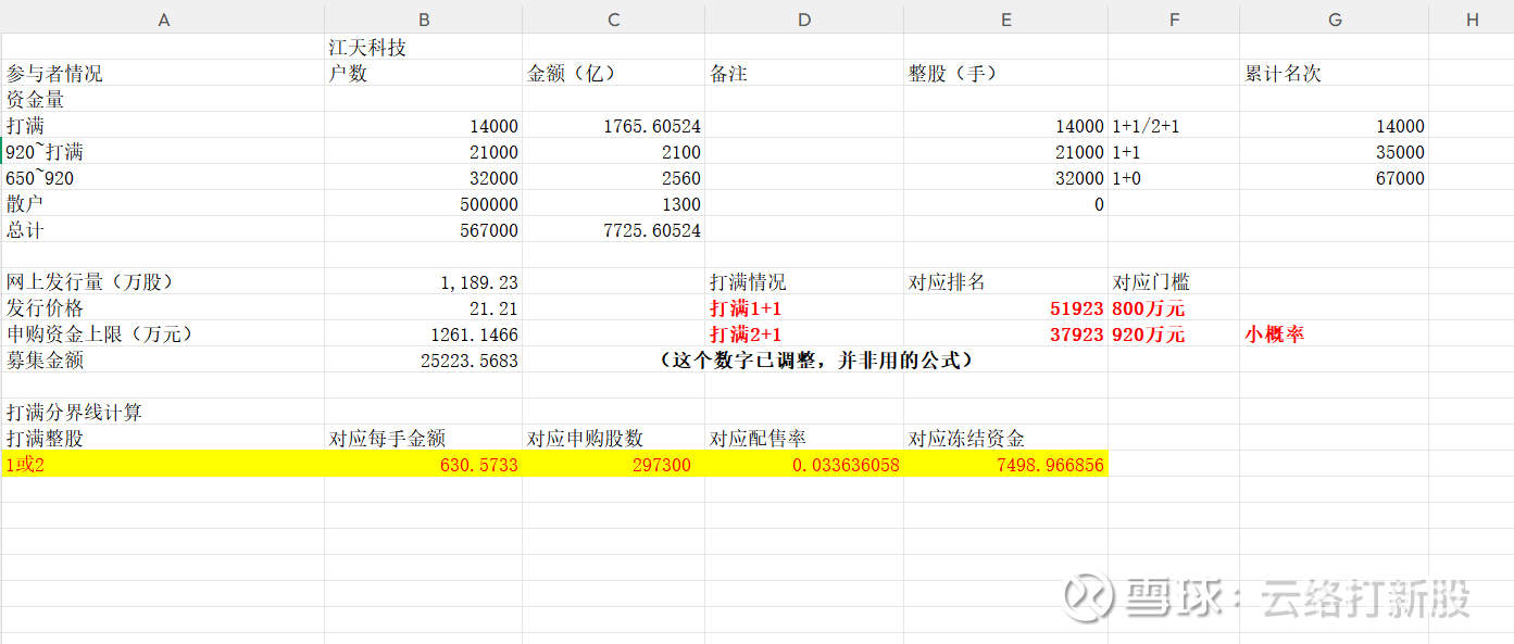 对于碎股,我们目前可以拿到的明牌数据,为精创电气大于554万元共计77,067户,786万53,073户,考虑到本次是小盘股+高价,盘子比精创电气少了112万股,如果打满1+1,碎股门槛会略高于精创电气,如果打满2+1,虽然是小概率,但是也要考虑,我认为碎股门槛会超过900万元,甚至达到920万元。