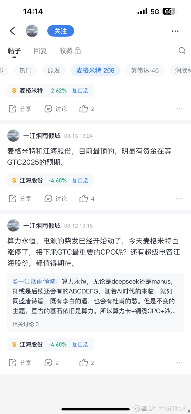一江烟雨倾城第一次发评论是今年3月份,3月12日提及之后,3月14日达到了70.22元高点,关注的也好推荐的也罢,涨涨跌跌很正常。我虽然一月份,发现了产业链吹票卖出,但是随后跌到55元附近已经满仓,这一轮我也是满仓下跌,截至之后,她就跟普通散户没有区别。