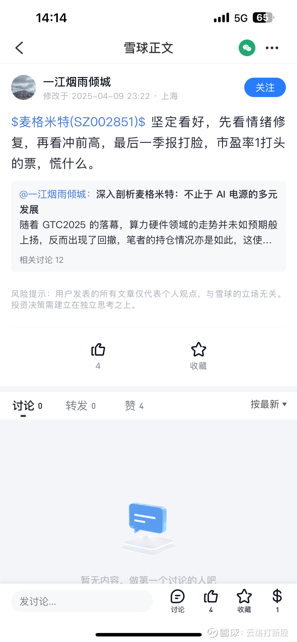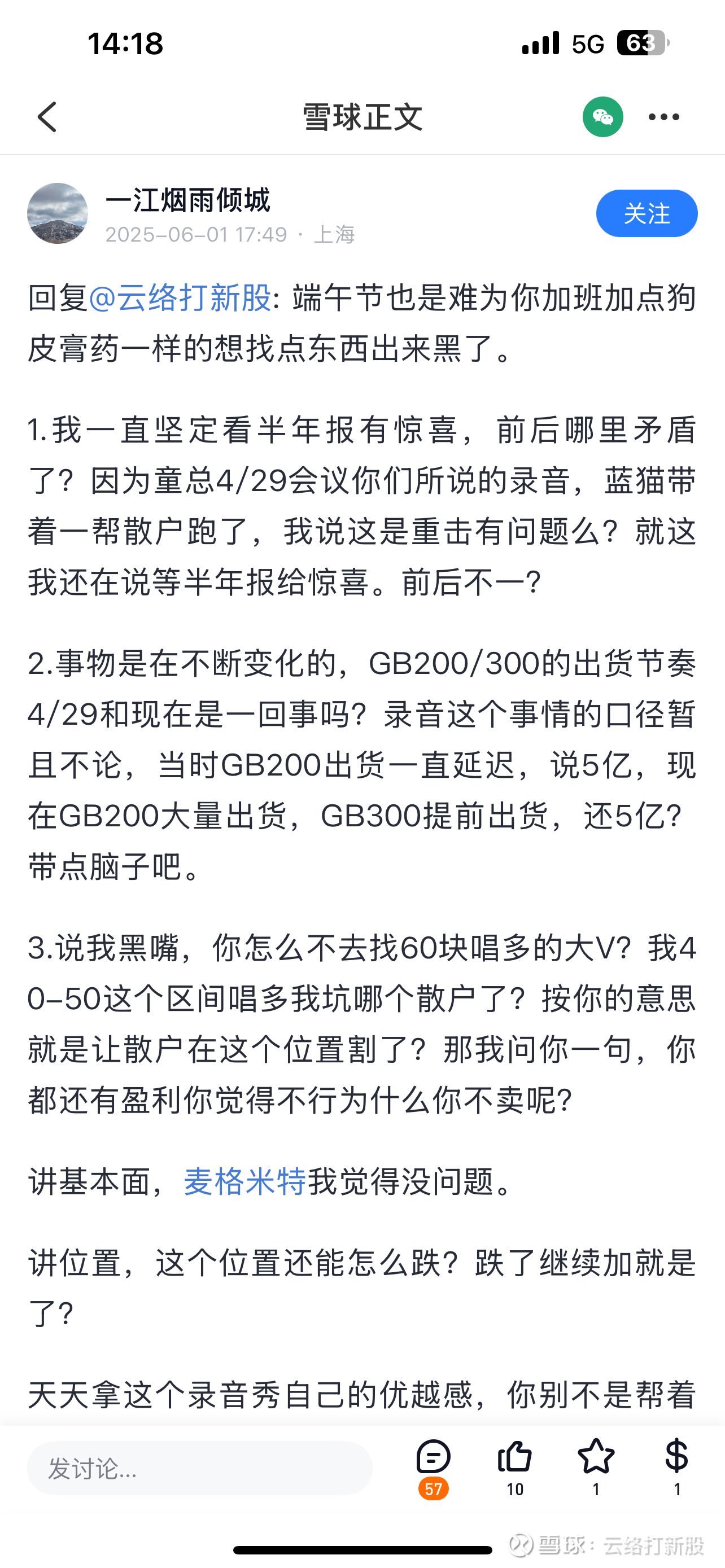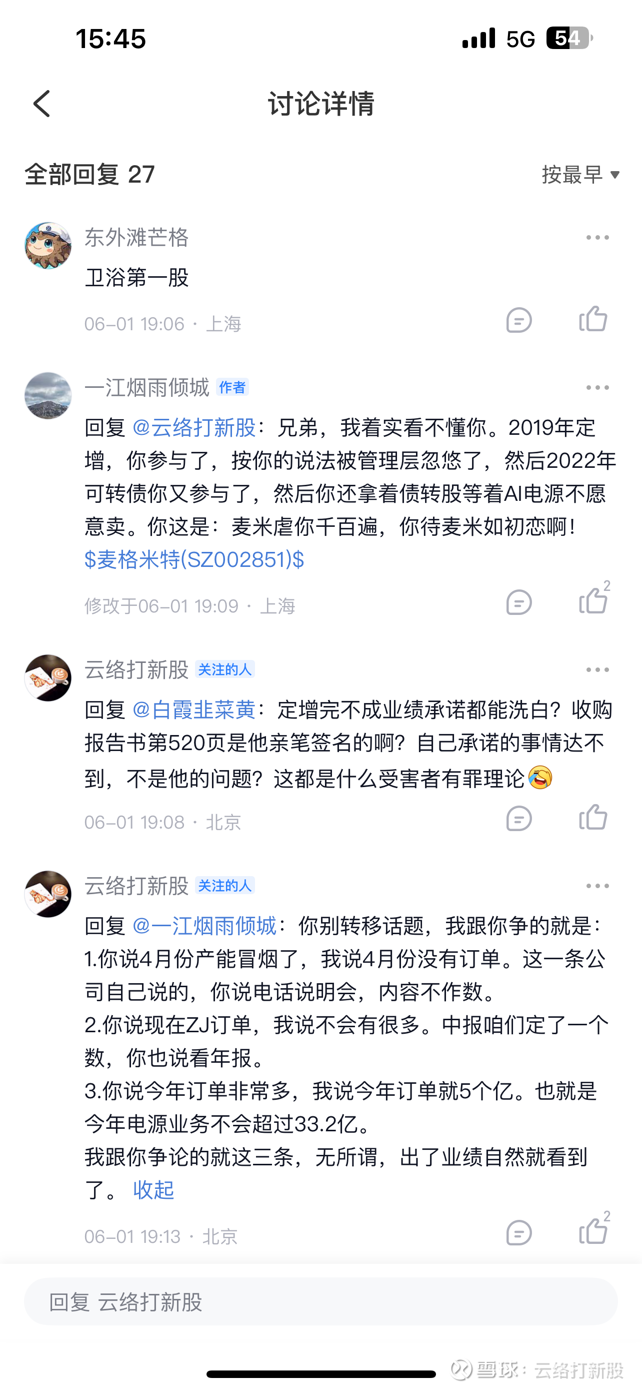 雪球从来不缺什么产业链,哪怕现在已经盖棺定论,相信惠城环保的裂解效益的,相信永安药业牛磺酸市场规模的,相信上海电力要重组的,依旧大有人在。麦格米特本身不差,我作为拿了很多年的股东,也深入研究过公司。但就是这些人今年才来,来了之后天天转发不明来源的文章,他们把这里搞得乌烟瘴气之后,还装白莲花,把责任推给了正常研究公司的人,仿佛只要不跟着吹牛就是唱空一样。按照他们的话术,公司老板也是公司的大空头,正常业绩交流变成了“压价”。