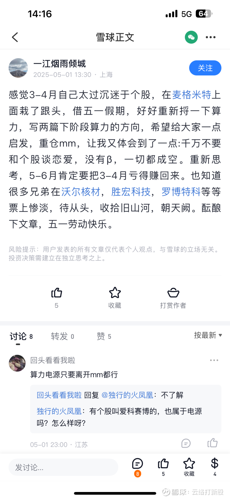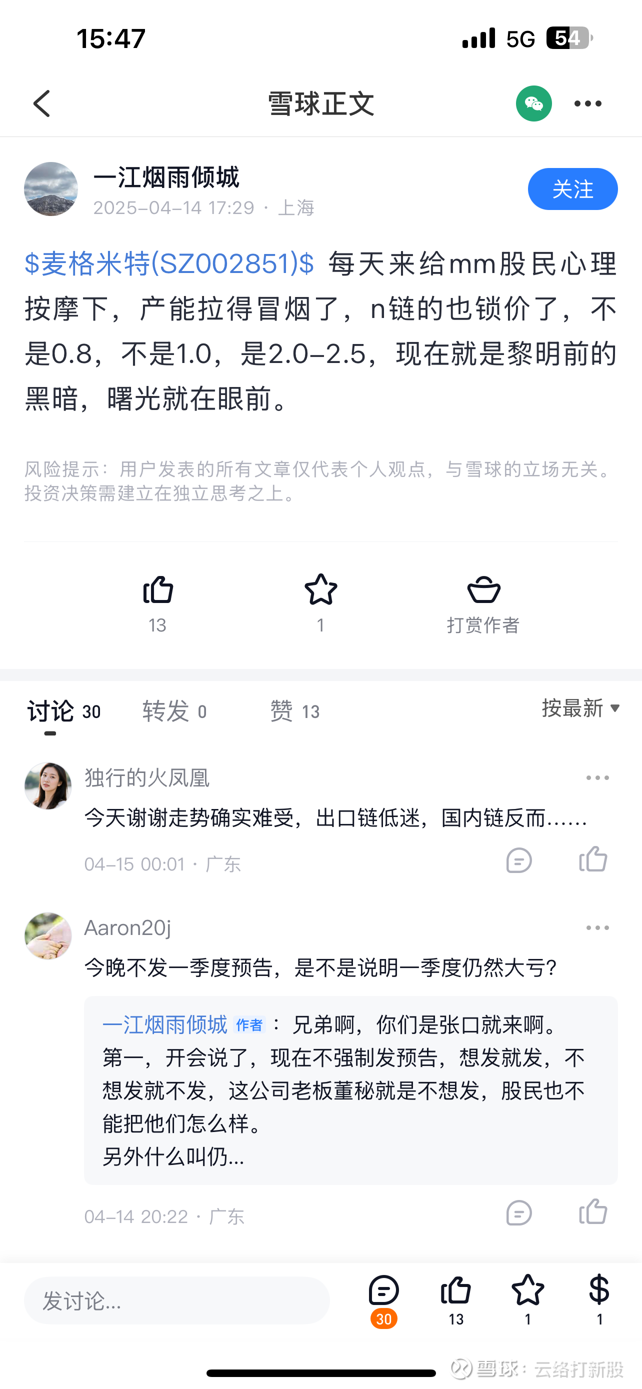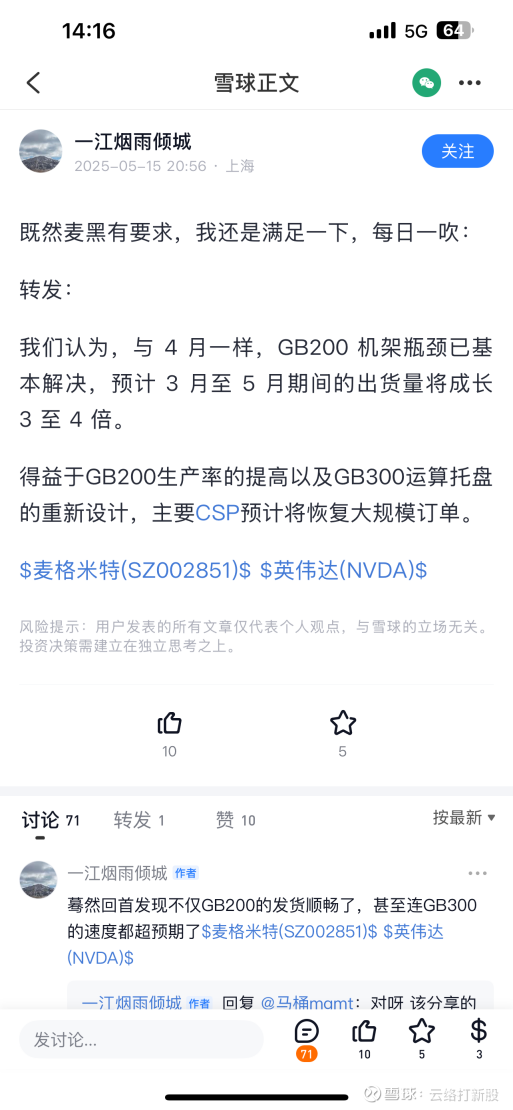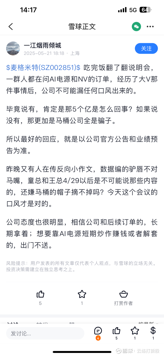一江烟雨倾城一定也是得知了相关消息,因为5-1当天的发言非常沮丧。当然了,我同样重仓麦格米特,也沮丧,但是既然公司官方给了业绩指引,按照业绩指引去预期就足够了。