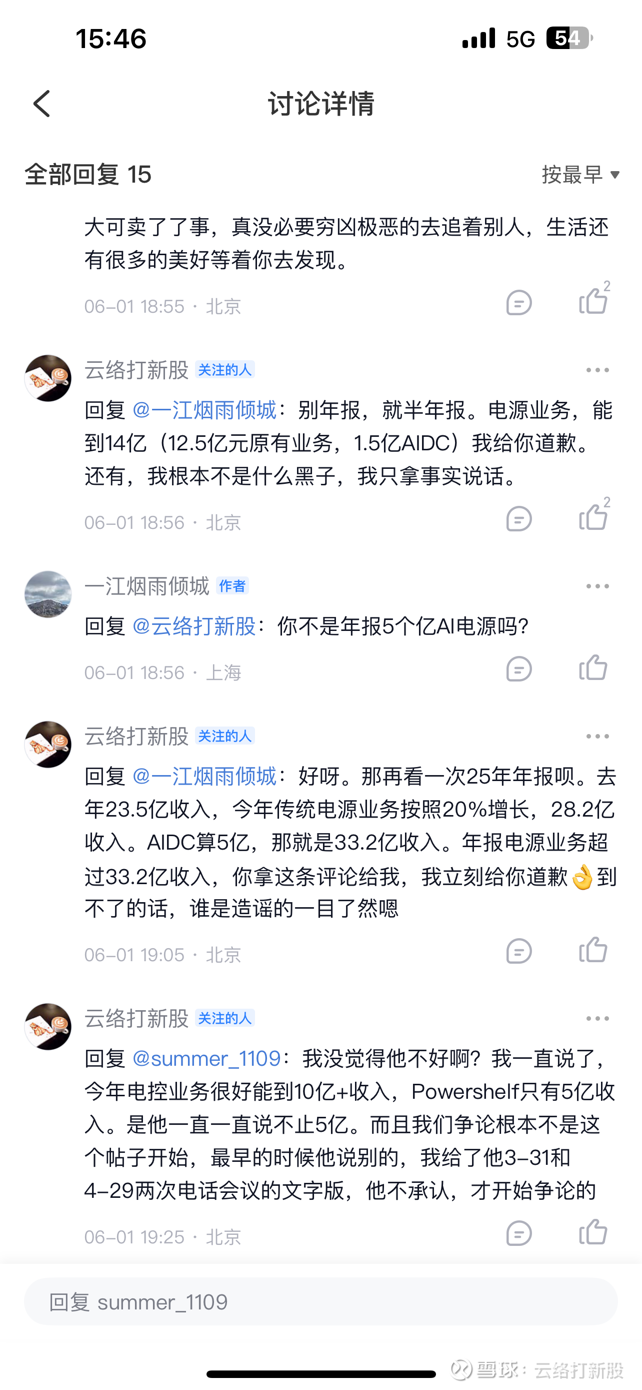一江烟雨倾城擅于偷换概念,转移矛盾。比如我作为买入时间远早于其,且一直坚信有合同的,仅仅是因为引用了公司老板的数据,被其扣上了黑嘴的帽子。很多人被蛊惑有了先入为主的概念,喷我之前看完我所有的截图,哪怕不看我文字,也必须看完截图再说。