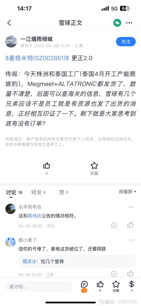 但是当时我也查找了,至少国内并没有株洲麦格米特,和奥川电子已经出货的信息。至于境外流传,外国人难道也买了麦格米特要造谣?那么这条传闻,转发自何处?