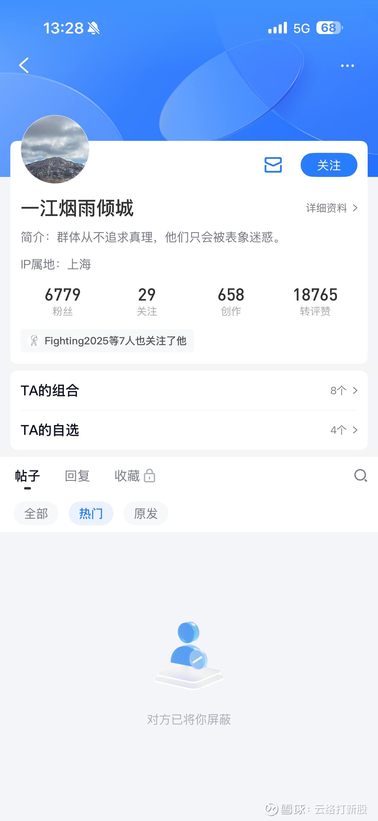 “一江烟雨倾城”的个性签名是:“群体从不追求真理,他们只会被表象迷惑。”怪不得你只靠转发和拉踩,就可以有这么多人气。