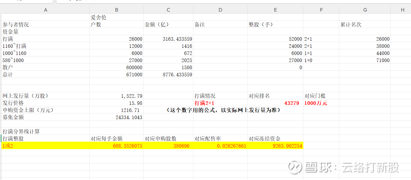 爱舍伦我给的572万整股,950万碎股,俩数据都略低于实际值,而其中配售户数低于我预期比较多,大约7.1万户,相对于我预测的7.7万户碎股还少了,更可以说明2+1账户远远高于我的预期。考虑到本次目标1+1的翻车数量很大,因此给出2+1账户38000户,1+1账户6000户的判断。