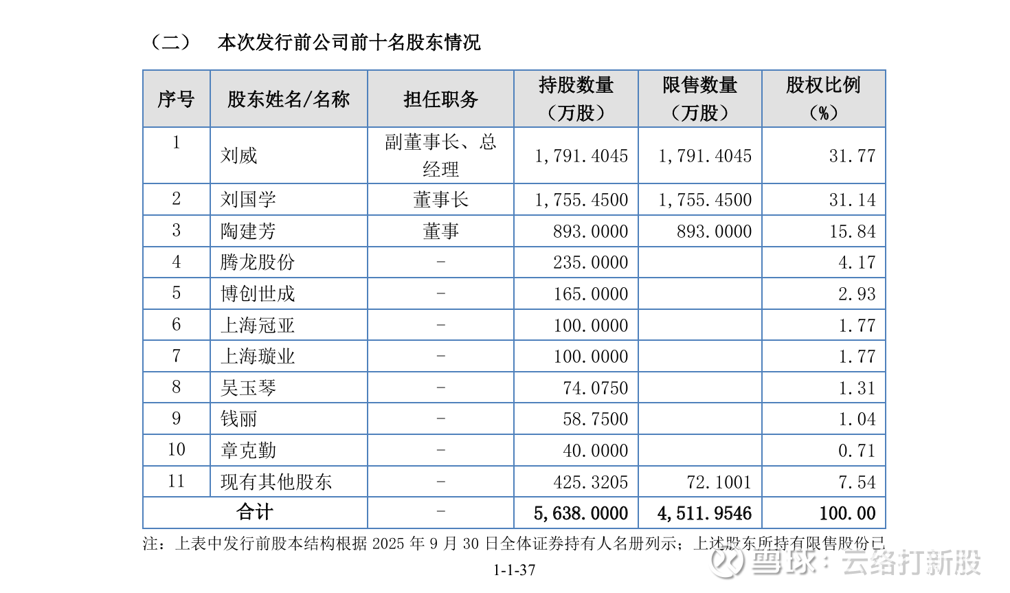 公司限售后股东情况如下:
