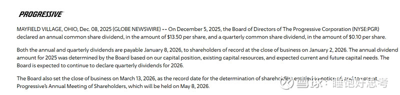 $Progressive(PGR)$ 宣布年度股息$13.5,股息率6%,2025 EPS按$18算的话payout ratio 75%。上次大力度分红是在2020年(DPS 4.9 / EPS 9.66),5年下来的DPS CAGR 22%。