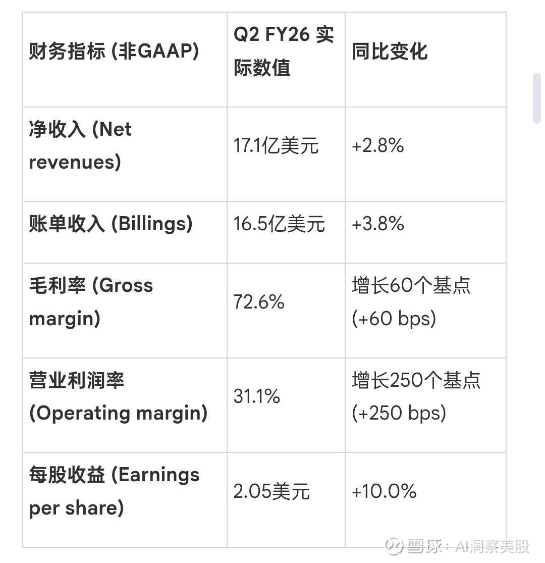 Q3 FY26 财务指引 (非GAAP) | 指标 | 预期范围 | | :--- | :--- | | 净收入 | 16.15亿 - 17.65亿美元 | | 毛利率 | 72.3% - 73.3% | | 营业利润率 | 30.5% - 31.5% | | 每股收益 | 2.01 - 2.11美元 |