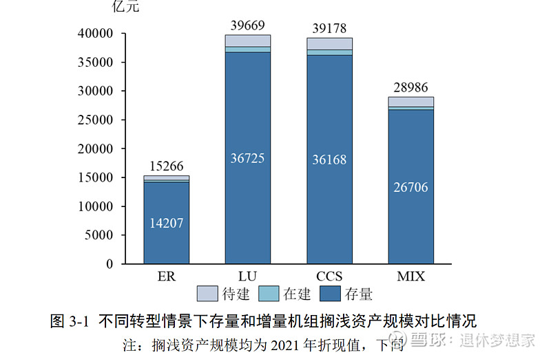 搁浅资产的年际分布与中国煤电机组的年龄结构有关,煤电机组的平均服役年限短,平均服役年限仅为 12 年,2015年中国煤电审批程序的行政变更导致新增煤电产能回升明显,年新增装机容量达到 80GW,这部分机组将于 2035 年提前退役,造成高额的煤电资产损失。而增量煤电机组的搁浅风险将在 2050 年前出现新的高峰期,这是由于新冠疫情后大量新规划、核准和建设煤电机组将在此时间段内提前退役导致的。