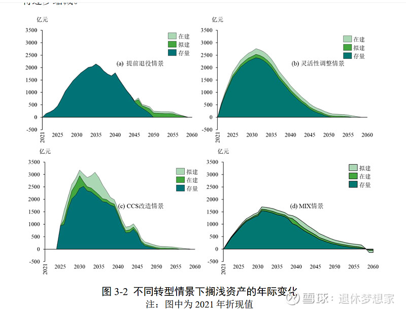 灵活性调整情景和 CCS 改造情景下,搁浅资产的产生主要集中于近 15 年间即 2035年前。灵活性调整情景下使得存量和增量煤电机组面临寿命期全面的净现金流损失,峰值时间约为 2030-2035 年间,较提前退役情景有所提前,峰值水平也略有提高,搁浅资产总规模达到 2757.8 亿元。灵活性调整将影响大部分机组的运行小时数,直至达到最小技术出力,随着煤电机组的服役期满,资产损失的规模将逐步缩减。