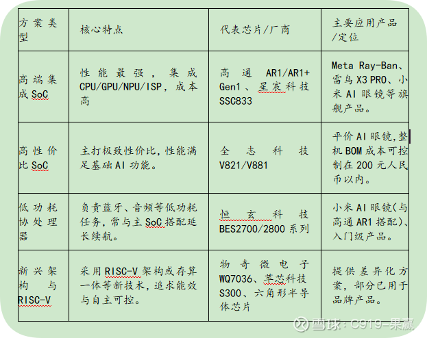 (一)AI眼镜芯片“方案类型”可按主控芯片性能与架构划分