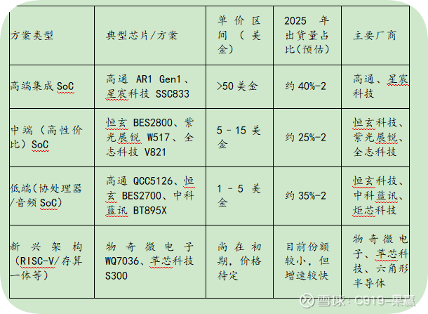 “高端集成SoC”占比最高:虽然单价高,但因旗舰产品(如RayBan Meta、小米AI眼镜)采用,出货量占比约40%,是市场收入的主力。