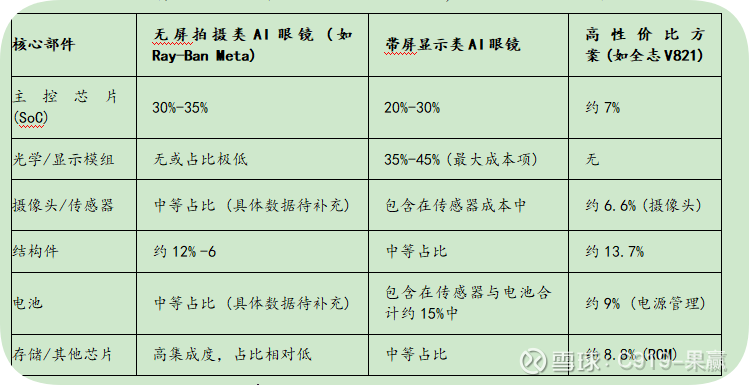 成本占比高:主控SoC占整机BOM成本约30%,在拍摄类眼镜中占比可达1/3。