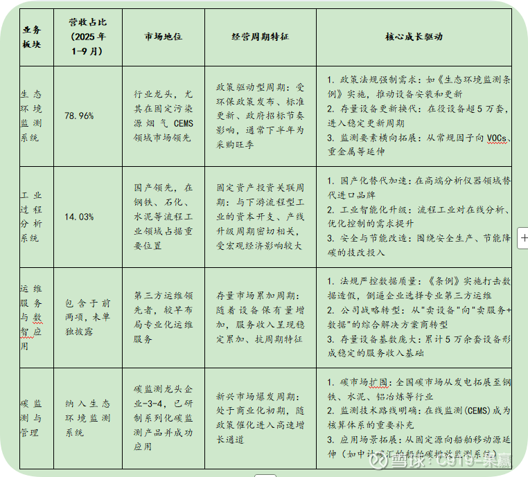基本盘(生态环境监测):占比近80%,市场地位稳固,受益于政策法规和存量更新,提供稳定的现金流和利润基础。