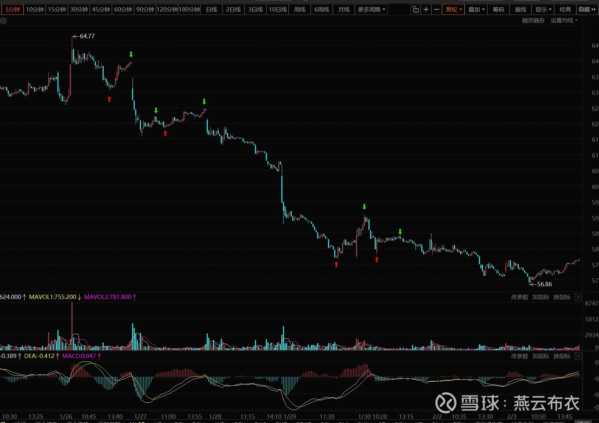 但注意,一旦5分钟第一次回调跌破了56.86,就坚决不要参与了。