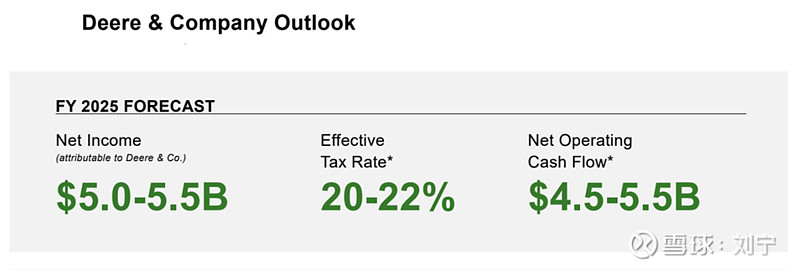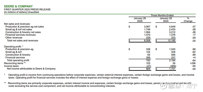 $约翰迪尔(DE)$ 今天Deere出了25年1季报,业绩不大好继续处于下行周期通道中,1季度收入85亿美元下滑了30%,运营利润近8亿美元下滑64%。公司维持今年50亿-55亿美元利润的指引。