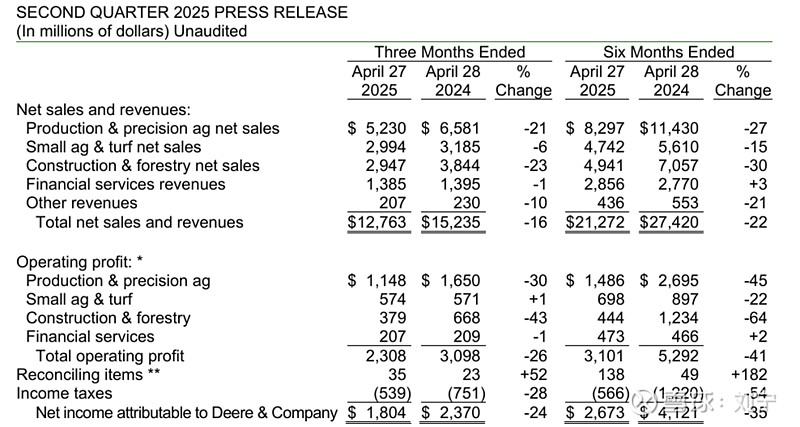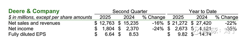 $约翰迪尔(DE)$ Deere的2季度业绩较1季度有较大的环比改善,收入128亿美元同比下滑16%,运营利润23亿美元下滑26%,EPS6.64美元,比较1季度的85亿美元收入和8亿运营利润有了大幅改善,也大幅超越了市场的预期(预期EPS5.6美元)。