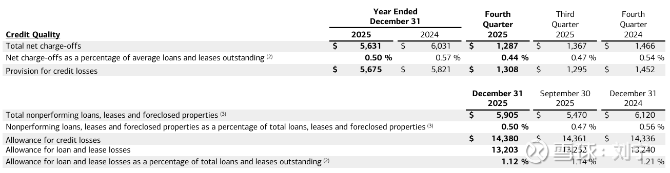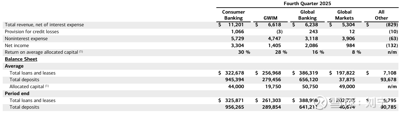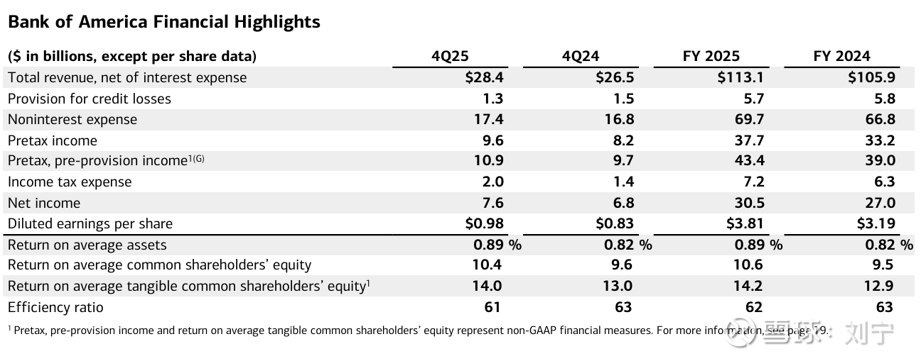 $美国银行(BAC)$ 美国银行今天的25年4季报和全年业绩都很好,季度收入284亿美元增长7%(其中净息差收入158亿美元增长10%),净利润76亿,EPS0.98美元增长18%,全年净利润305亿美元,EPS3.81美元增长19%(跟当年的$招商银行(SH600036)$一样高增长),除了传统银行业务外,投行,交易还有资管业务的业绩都很好,资产质量也保持了稳定。