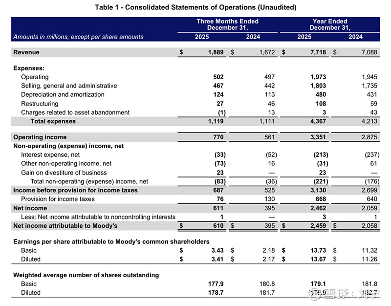 $穆迪(MCO)$ 穆迪今天披露了25年4季度和全年业绩,在利差小流动性好的大环境下,4季度业绩非常好,分析业务收入9.4亿美元增长9%,而评级业务收入近9.5亿美元增长高达17%。全年下来,调整后每股盈利超出指引达到了14.94美元增长20%,而公司更是给出了26年预期每股盈利16.4到17美元的指引。