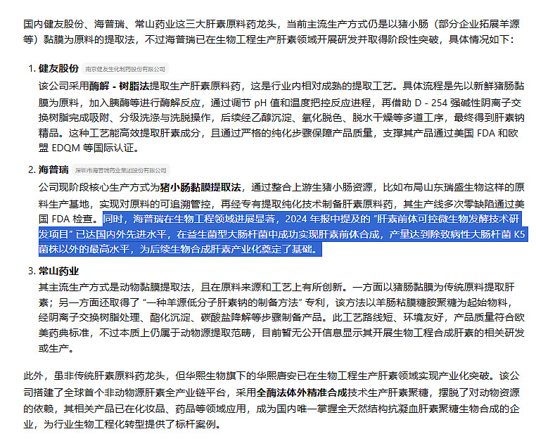 $海正药业(SH600267)$ 健友股份是国内肝素原料药生产龙头,拥有 12 条通过 FDA 认证的产线,还是国内唯一拥有三种低分子肝素制剂批件的企业;海普瑞的肝素原料药出口占比高,2024 年该业务营收超 40 亿元,产销量和毛利率领先;常山药业覆盖肝素粗品、原料药、制剂全产业链,同时布局相关创新药,通过垂直整合降低成本。这三家企业合计占据约 60% 的市场份额。