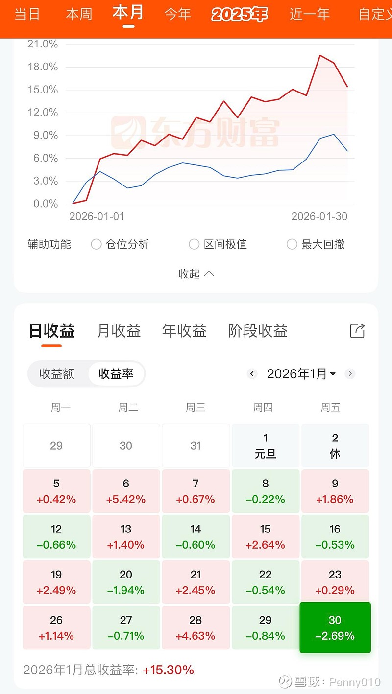 2026年1月和年度收益为15.3%。除了收官日惨烈,整月运行平稳,阴阳交替为主,持仓标的随场内资金流入,多少都喝到点汤。2月力争不赔钱,决战在3月。