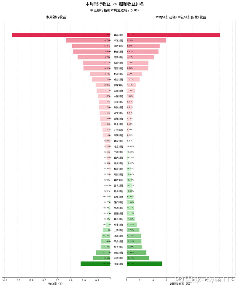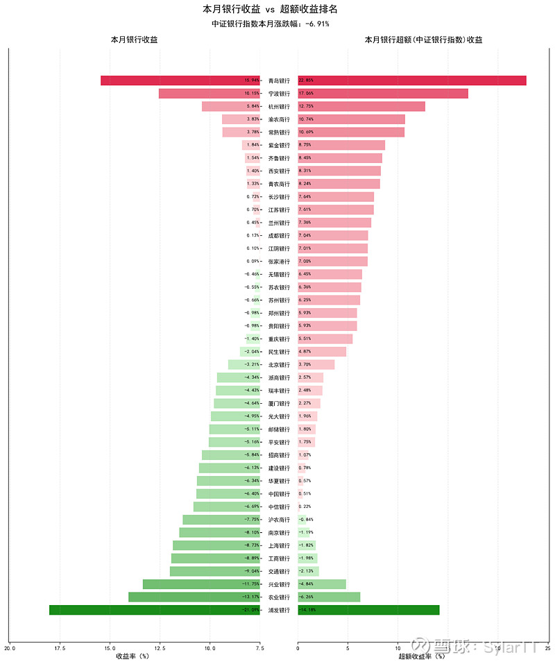 这段时间银行板块确实不好做,$中证银行(SZ399986)$ 指数整个月跌了6.8%,很多投资者都被套牢了。但有意思的是,在这样的弱势环境下,居然有几家银行逆势走强,尤其是青岛银行,简直是黑暗中的一束光,这反差感太强烈了。