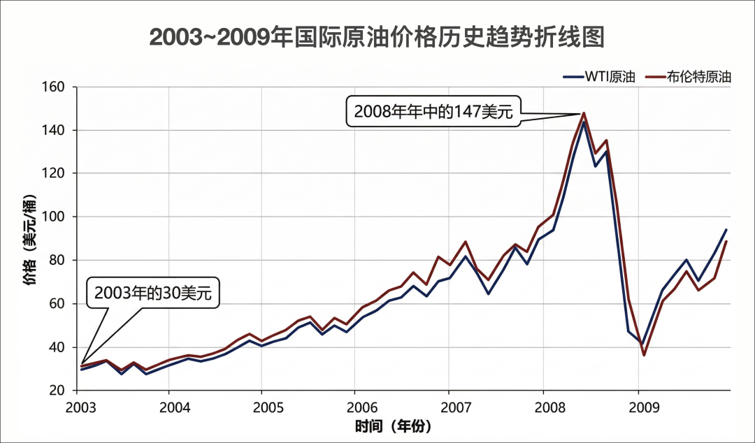 而在2003年至2008年期间,全球原油市场正经历一场史无前例的狂飙。受新兴市场(尤其是中国和印度)强劲工业需求的驱动,叠加原油勘探开发周期长、供给端缺乏弹性的现实,国际油价从约30美元/桶一路飙升至2008年年中的147美元/桶历史高点。