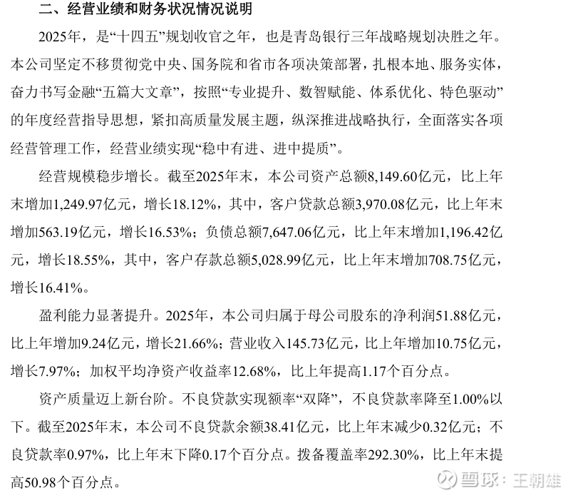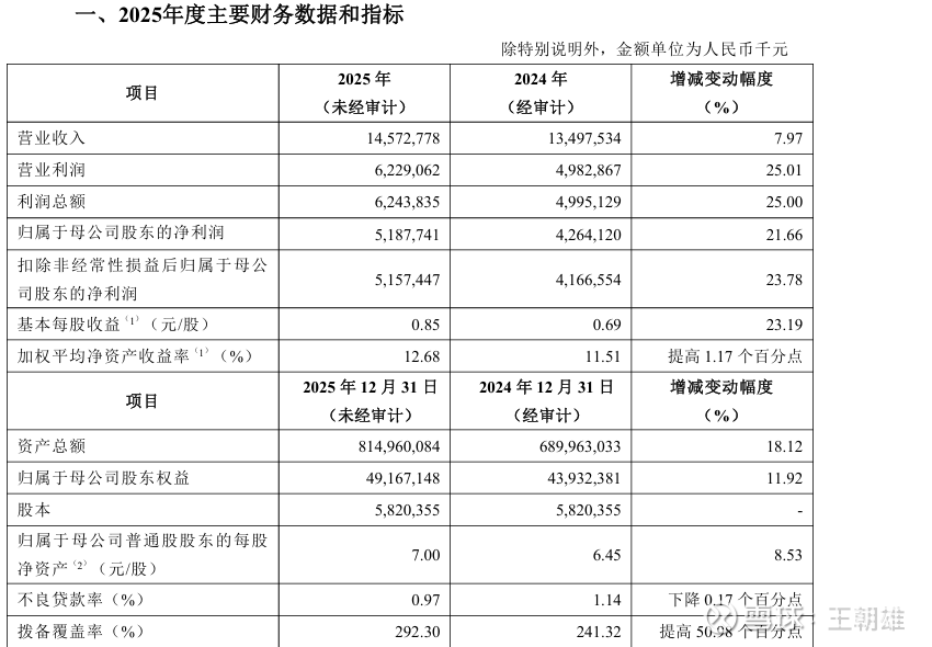 一 2025年全年情况:每股利润增长23.19%,从0.69元到0.85元,更加重要的是净资产收益率从11.51%提高到了12.68%;还有资产质量越来越好,不良比率同1.14%下降到了0.97%,拨备覆盖率从241.32%提高到了292.30%。