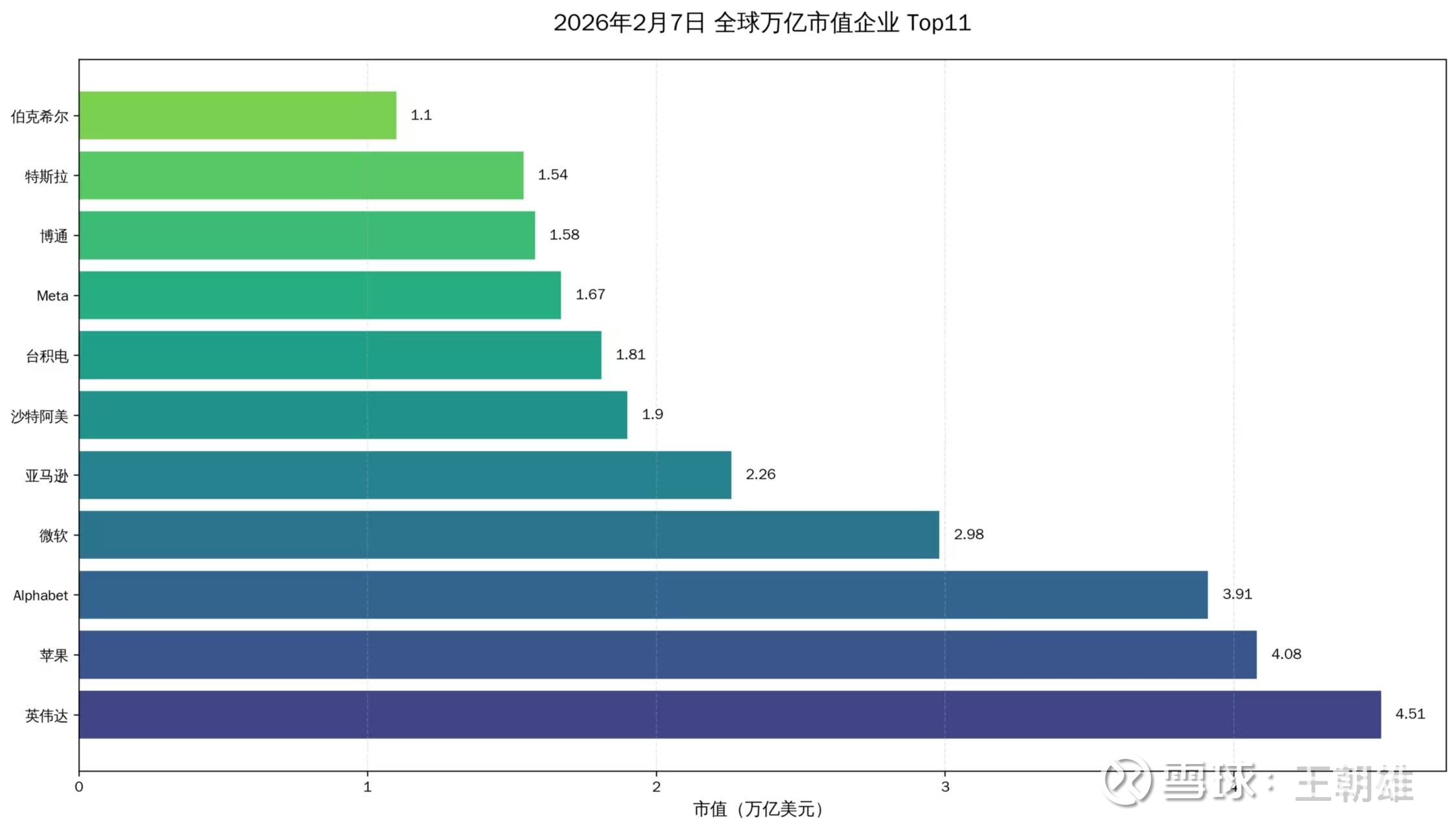 全球的银行、保险、证券、信托、资管、地产等金融企业,不计其数!金融企业唯一进入万亿美金俱乐部的企业,只有巴菲特控制并管理的伯克希尔,到2026年2月6号收盘总市值为1.1万亿美金,排在万亿俱乐部11家企业的第11位。