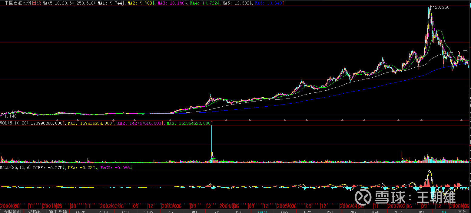 我们还是进行统计,中国石油从2002年到2006年每股利润分别为(因为在2007年上半年开始大批量抛售,所以统计2002-2006年):0.27/0.40/0.59/0.75/0.79元!增长2.93倍,年化为30.83%,这是典型的高成长性企业了。