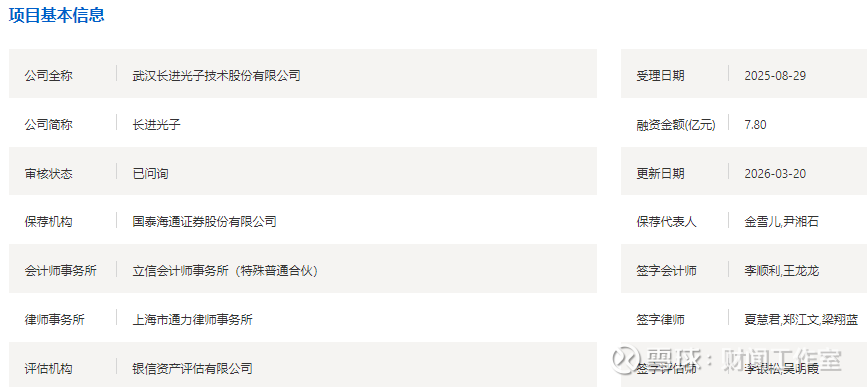 武汉长进光子技术股份有限公司(简称:长进光子)当前正冲击科创板IPO,保荐机构为:国泰海通证券,保荐代表人为:金雪儿、尹湘石。