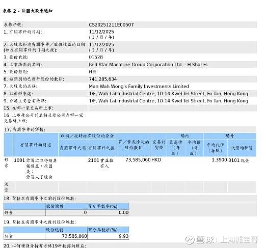 12月12日消息,根据香港联交所12月12日披露的文件,Man Wah Wong's Family Investments Limited于12月11日以每股均价1.39港元场外增持红星美凯龙7,358.51万股H股股份,价值约1.02亿港元。增持后,Man Wah Wong's Family Investments Limited最新持股数目为7,358.51万股股份,好仓比例由0.00%升至9.93%。