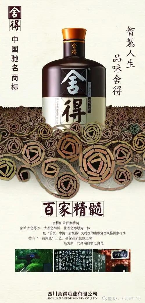 $复星国际(00656)$ 旗下的舍得酒,是中国第一文化酒。舍得酒自上市以来,以深厚的文化内涵和“百斤好酒,仅得两斤舍得精华”的上乘品质赢得了广大消费者的追捧,于2006年成为中国驰名商标。上海世博会期间,舍得酒代表中国高端白酒和川酒参展上海世博会,向世界亮出了中国的第一张文化名片。舍得酒的广告语是“智慧人生,品味舍得”,“百斤好酒,仅得两斤舍得精华”“舍得智慧,领袖情怀”等等。舍得酒开创了中国生态酿酒的先河,为中国第一生态酒。